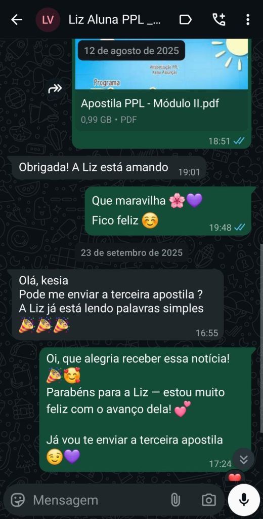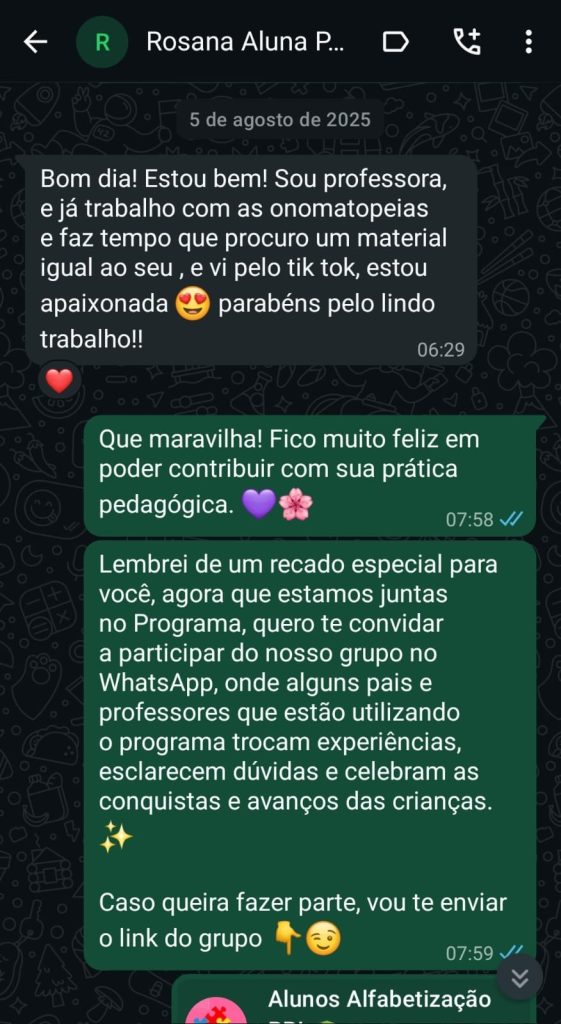 Você conta com meu suporte direto ao longo da jornada, orientando, esclarecendo dúvidas e acompanhando cada etapa da alfabetização do seu filho.