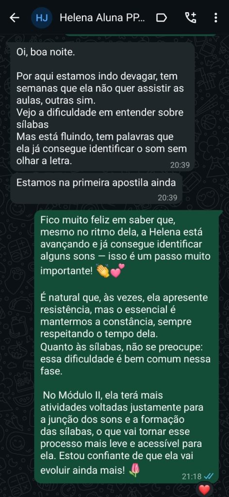 Evolução perceptível ao longo do processo, com avanços graduais que fortalecem a base da alfabetização e trazem mais segurança para a criança e para a família.